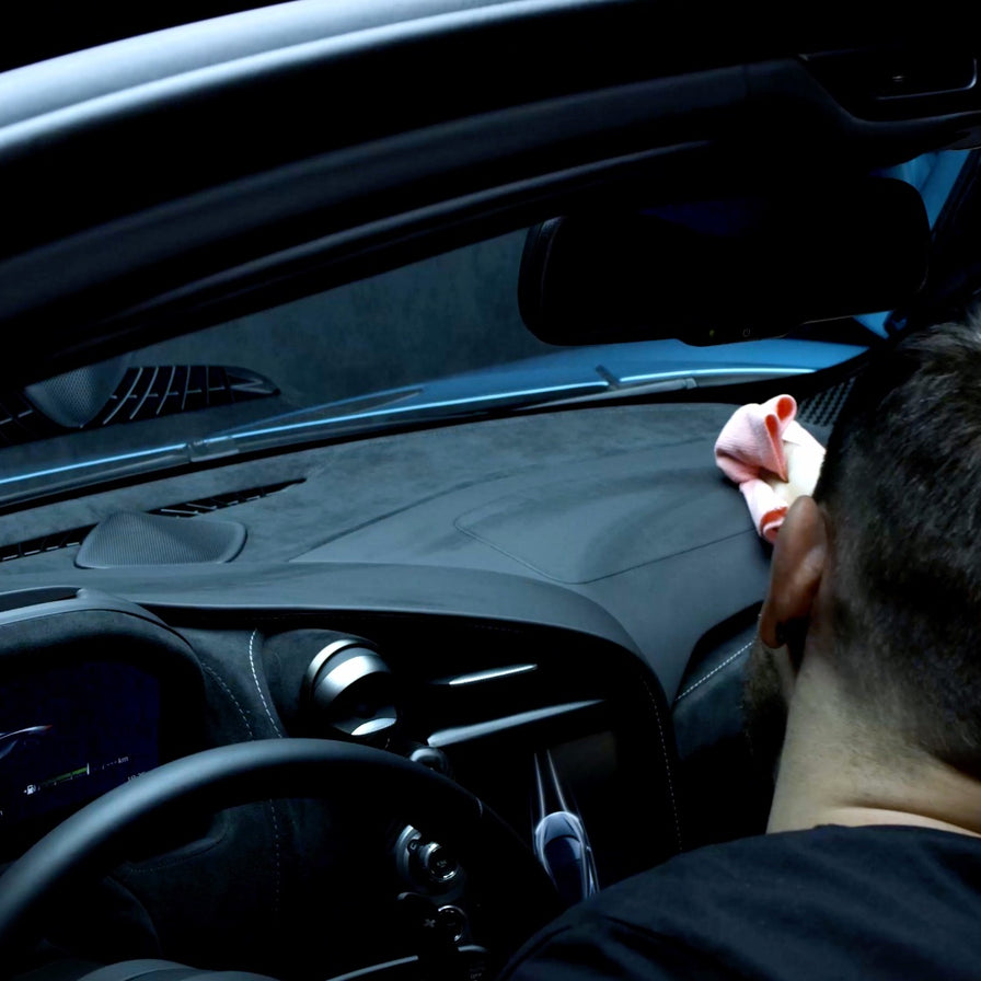 3. Swissvax Quick Interior Finish auf ein sauberes Swissvax Micro-Wash Mikrofasertuch (gelb) aufsprühen und gleichmässig verteilen.